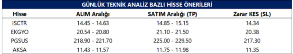 Böylece Tacirler Yatırım tarafından 2 Ekim 2025 tarihinde paylaşılan günlük teknik analiz bazlı hisse önerileri listesinde, AKSA, ISCTR, EKGYO ve PGSUS hisseleri olmak üzere toplam 4 hisse yer almış oldu.