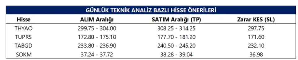 Böylece Tacirler Yatırım tarafından 15 Ekim 2025 tarihinde paylaşılan günlük teknik analiz bazlı hisse önerileri listesinde, THYAO, TUPRS, TABGD ve SOKM hisseleri olmak üzere toplam 4 hisse yer almış oldu.