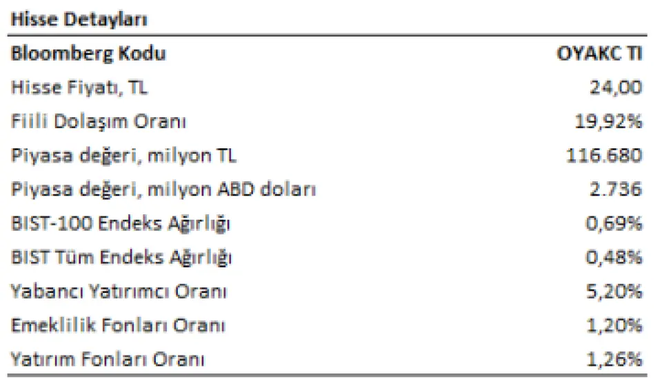 OYAKC hissesini uzun vadeli değerlendiren kurum, hisseye 30,70 TL hedef fiyat vermişti. OYAKC borsada 23 TL civarı fiyatlardan işlem görüyor.