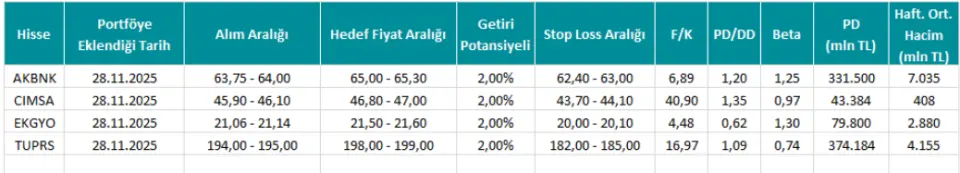 Hisselerin portföyle eklendiği tarih 28.11.2025 olarak kaydedildi. AKBNK hissesi için hedef fiyat aralığı 65,00 - 65,30 olarak açıklandı. CIMSA hissesine açıklanan hedef fiyat aralığı ise 46,80 - 47,00 olarak listeye yansıdı. EKGYO hissesi için hedef fiyat aralığı 21,50 - 21,60 olarak açıklandı. Son olarak TUPRS hissesi için açıklanan hedef fiyat aralığı 198,00 - 199,00 olarak yatırımcılar ile paylaşıldı.