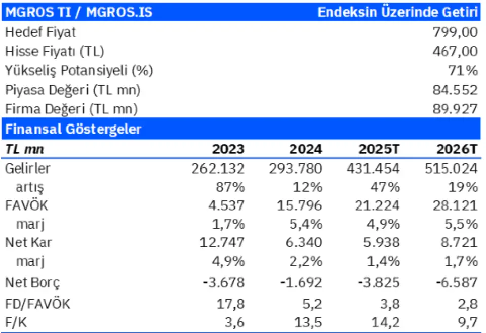 Borsamızın en çok kazandıran hisselerinden olan MGROS için beklentiler devam ediyor. Gedik Yatırım model portföyünde de bulunan MGROS hissesine 799 TL hedef fiyat açıkladı. Bu hedef ile hissede beklenen kazanç potansiyeli %71 oranında oldu.