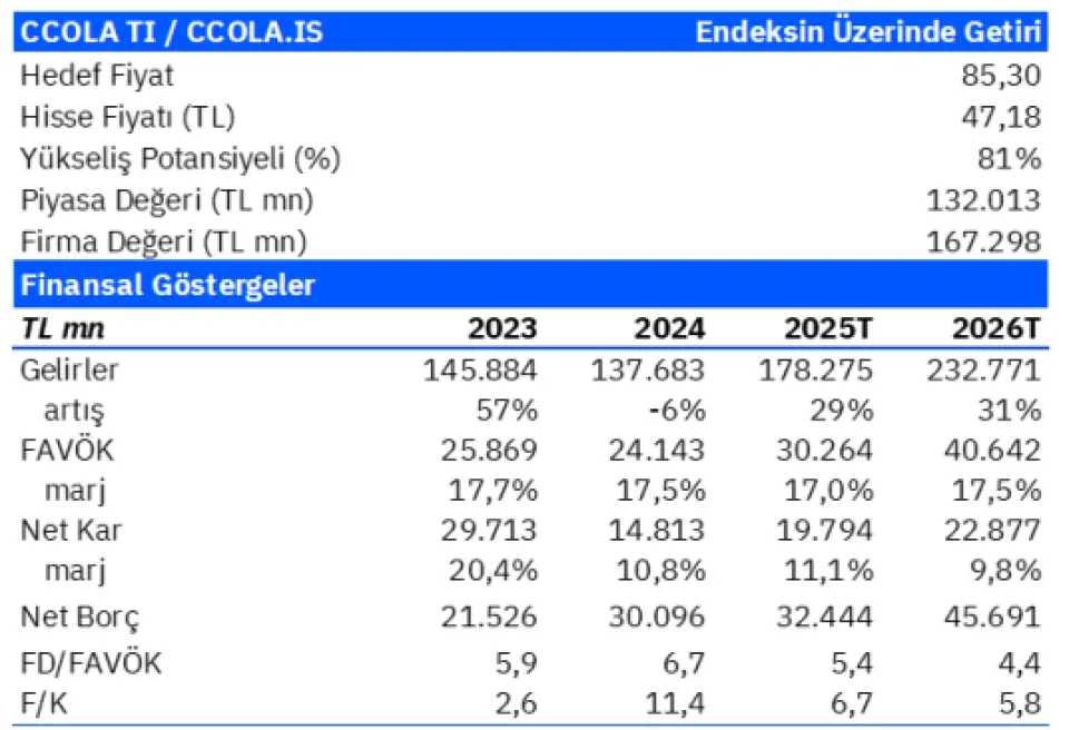 Gedik Yatırım, bu günlerde 47 TL civarı işlem gören CCOLA hissesi için 85,30 TL hedef fiyat açıkladı. Hisseyi model portföyünde de bulunduran kurum hissede %81 kazanç potansiyeli görüyor.