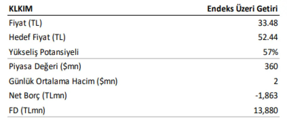 KLKIM için hedef fiyatımızı hisse başına 52,44 TL’ye revize ederken (önceki: 47,40 TL) “Endeks Üzeri Getiri” tavsiyemizi sürdürüyoruz. 2026T’ye göre hisse 9,9x F/K ve 4,6x FD/FAVÖK ile işlem görmektedir.