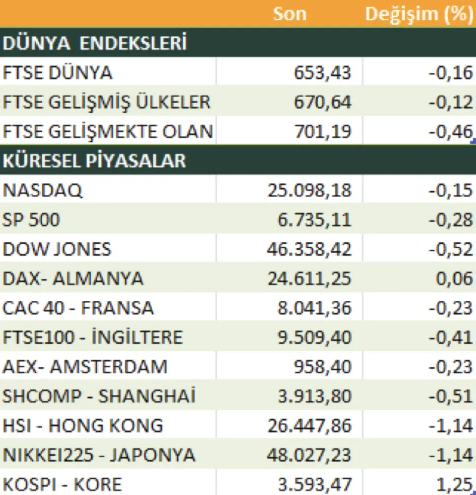 Avrupa tarafında ise endeksler ABD’deki hafif geri çekilmeyi izleyerek günü sınırlı düşüşle tamamladı. Özellikle bankacılık ve enerji hisselerindeki zayıflık endeksleri aşağı çekerken, Fransa ve Almanya’da siyasi belirsizliklerin devam etmesi risk iştahını sınırladı. Ancak yapay zekâ ve teknoloji hisselerine yönelik güçlü beklentiler, satışların derinleşmesini önledi.