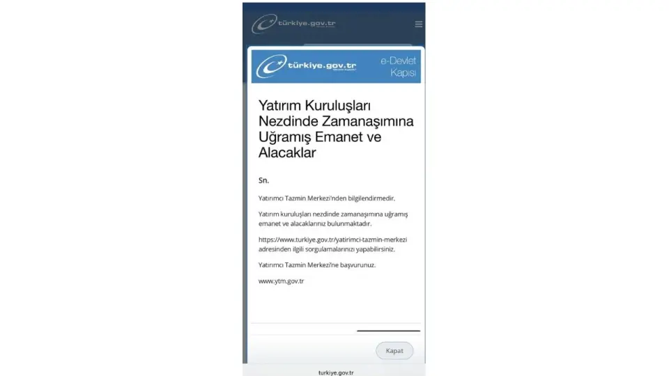 e-Devlet üzerinden binlerce vatandaşa, Yatırımcı Tazmin Merkezi (YTM) tarafından bilgilendirme mesajı gösterilmeye başlandı. Sisteme giriş yapan kullanıcıların ekranına çıkan mesajda, “Yatırım kuruluşları nezdinde zamanaşımına uğramış emanet ve alacaklarınız bulunmaktadır” ifadeleri yer aldı.