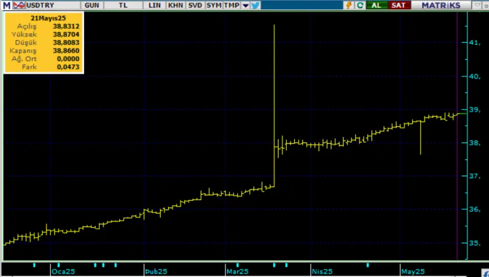 Bu sabah 38,85 civarında işlem görüyor. Aşağıda 38,50 ve 38,00; yukarıda 39,00 ve 39,50 öne çıkan teknik seviyeler.