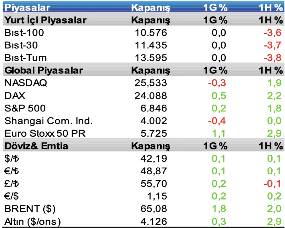Güne başlarken… BIST 100 endeksi dün günü %1,97 azalışla 10.576 puandan tamamladı. İşlem hacmi 174,5 milyar TL olarak gerçekleşti. Önceki kapanışa göre teknoloji endeksi %2,87, bankacılık endeksi %2,40, sınai endeksi %2,38 ve hizmetler endeksi %1,93 oranında değer kaybetti. BIST 100 endeksine dahil 15 hisse değer kazanırken, 84 hisse değer kaybetti.