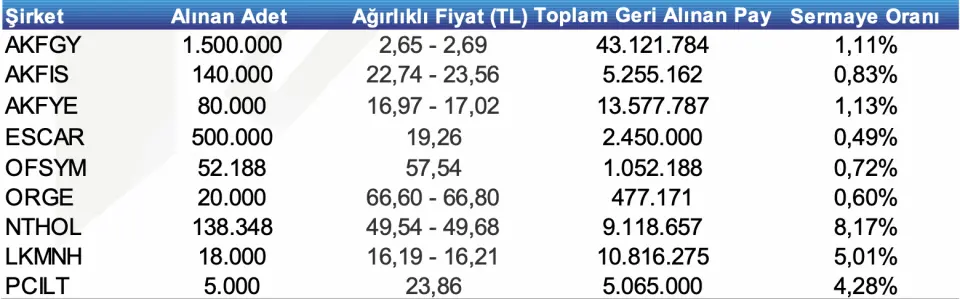 Vakıfbank <VAKBN TI> Şirket, 11.11.2025 tarihinde Vakıf GYO paylarında 2,45–2,55 TL fiyat aralığından toplam 28,7 mn adet alım gerçekleştirdiğini ve bu işlemler sonucunda Vakıf GYO’daki pay oranının %54,60’a yükseldiğini açıkladı. (Kaynak: KAP)