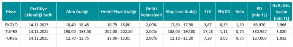 Hisselerin portföyle eklendiği tarih 14.11.2025 olarak kaydedildi. EKGYO hissesi için hedef fiyat aralığı 18,75 - 18,80 olarak açıklandı. TUPRS hissesine açıklanan hedef fiyat aralığı ise 202,00 - 202,50 olarak listeye yansıdı. Son olarak TURSG hissesi için açıklanan hedef fiyat aralığı 13,00 - 13,05 olarak yatırımcılar ile paylaşıldı.