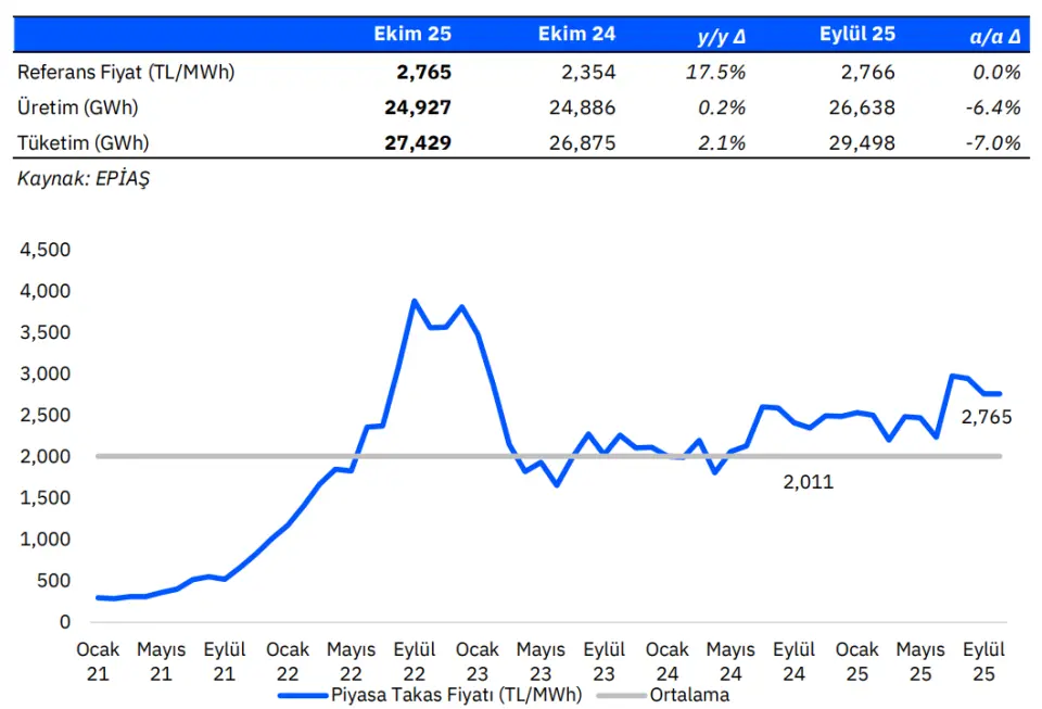 • Ekim 2025'te Türkiye'de elektrik üretimi yıllık bazda %0,2 artışla 24.927 GWh'ye ulaştı. Elektrik tüketimi ise yıllık bazda %2,1 artışla 27.429 GWh'ye ulaştı. • Ortalama spot elektrik fiyatları 2.765 TL/MWh olarak gerçekleşti; bu, yıllık bazda %17,5 artış ve aylık bazda aynı kaldığı anlamına geliyor.• BIST Elektrik Endeksi (XELKT) Eylül ayında %6,9 artış kaydetti ve BIST-100 Endeksi'nin %7,3 üzerinde performans gösterdi. • Elektrik üreticileri hisseleri arasında Aksa Enerji, BIST-100'ü %40 oranında geride bırakarak en iyi performansı gösterdi. Öte yandan, Biotrend Enerji %13 oranında geride kalarak en kötü performansı gösterdi.