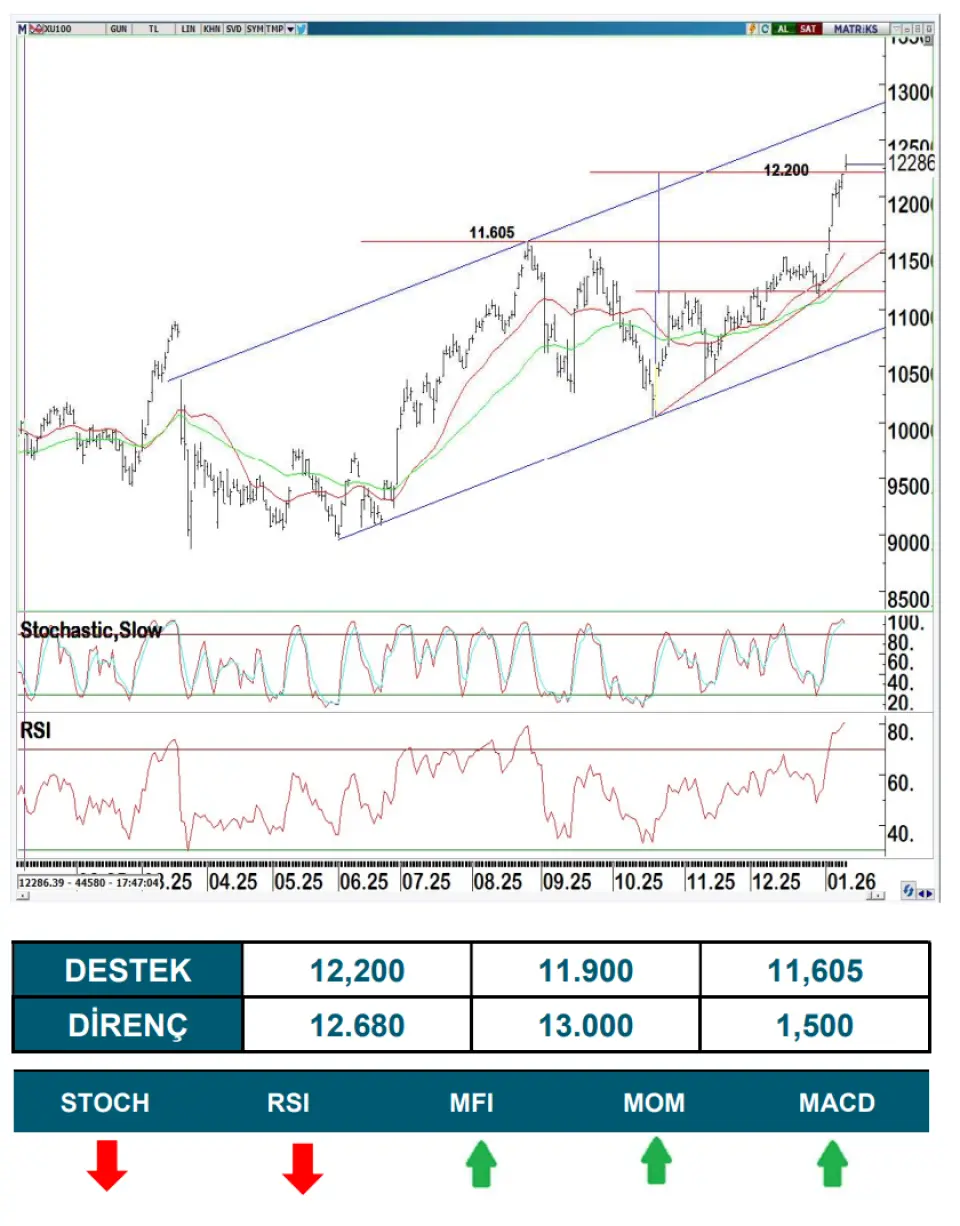 Taşınan pozisyonlar açısından ise 12.200 seviyesinin yakından izlenmesini öneriyoruz. Bu seviyenin üzerinde kalınamaması endekste baskıyı artırabilir. Bu nedenle 12.200 seviyesinin altında yapılacak fiyatlamalarda kısa vadeli açılmış yeni pozisyonların azaltılmasını veya kapatılmasını yararlı buluyoruz. Olası geri çekilmelerde ise 11.900 ve 11.605 seviyeleri alt destek bölgeleri olarak takip edilecektir. Endekste uzun vadeli yükselen trendinin üst bandı konumunda olan 12.680 seviyesini ise haftalık bazda direnç bölgesi olarak takip etmeye devam edeceğiz.