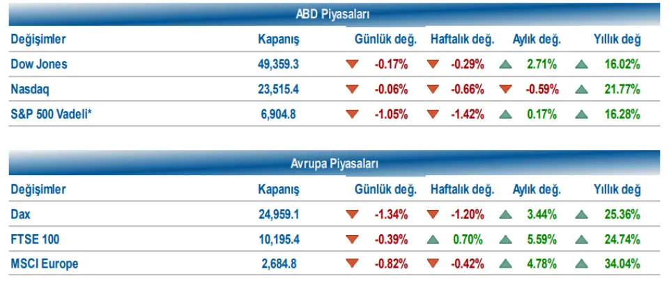 Bu gelişmeler ışığında Avrupa Birliği liderlerinin, ABD’nin ilave gümrük vergisi adımları sonrası 22 Ocak Perşembe günü olağanüstü zirvede bir araya gelmesi bekleniyor. AB Komisyonu adına konuşan Olof Gill, Avrupa’ya yönelik ek tarifeler devreye girerse Birliğin karşılık vermeye hazır olduğunu ve ekonomik çıkarların korunması için gerekli adımların atılacağını vurguladı. Artan jeopolitik gerilimler ile beraber Avrupa piyasalarında negatif seyir izlendi.