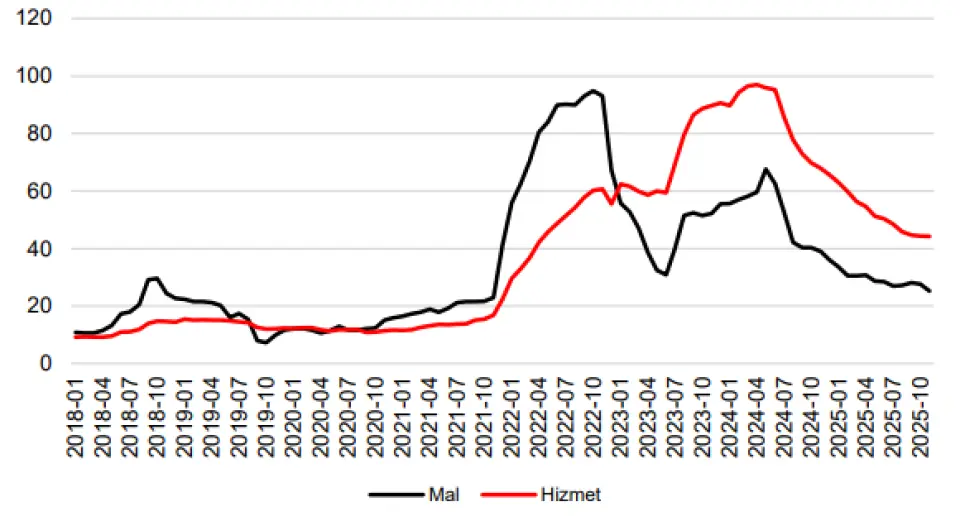 Mal enflasyonunda yavaşlama… Kasım ayında mal enflasyonu, ay boyunca düzenlenen kampanyaların etkisiyle aylık bazda %0,56 olarak gerçekleşti ve yıllık enflasyon %27,7'den %25,2'ye geriledi. İşlenmemiş gıda fiyatlarındaki %3,3'lük belirgin düşüş enflasyondaki yavaşlamanın ana nedeni olurken, enerji ve çekirdek mal enflasyonu sırasıyla %1,86 ve %0,92 olarak gerçekleşti. Yıllık bazda, çekirdek mal enflasyonu %18,6'ya gerilerken, enerji ve gıda hariç mallar %20,3, işlenmemiş gıda ise %19,4 (bir ay önce %34,7) olarak gerçekleşti. Bu arada, hizmet enflasyonu aylık bazda %1,46'ya (Ekim'deki %1,79'dan) gerilerken, yıllık oran %44,4'ten %44,2'ye düştü. Kira enflasyonu mevsimsellik sayesinde %2,5'e geriledi. Ulaşım hizmetleri %1,51, oteller ve restoranlar ise %0,89 arttı. İleriye baktığımızda, daha ılımlı ücret ayarlamalarının desteğiyle hizmetler enflasyonunun kademeli olarak yavaşlayacağını öngörüyoruz.