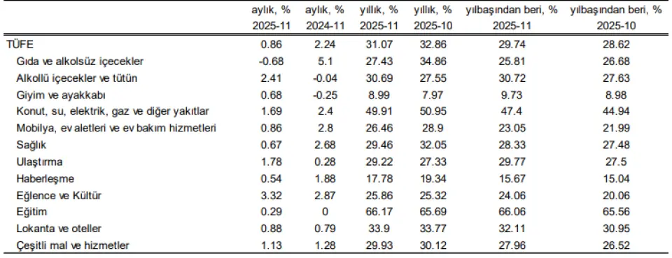 Aylık TÜFE enflasyonu %0,87... Kasım ayında TÜFE enflasyonu %0,87 ile piyasa beklentisi olan %1,3 ve bizim beklentimiz olan %1,53'ün oldukça altında gerçekleşti. Buna bağlı olarak, yıllık enflasyon oranı Ekim ayındaki %32,9'dan %31,1'e geriledi. Bu arada, B ve C endekslerine göre çekirdek enflasyon, bir ay önceki %32,5 ve %32,1'den sırasıyla %30,6 ve %30,3'e gerilerken, aylık rakamlar sırasıyla %1,27 ve %1,22 oldu.