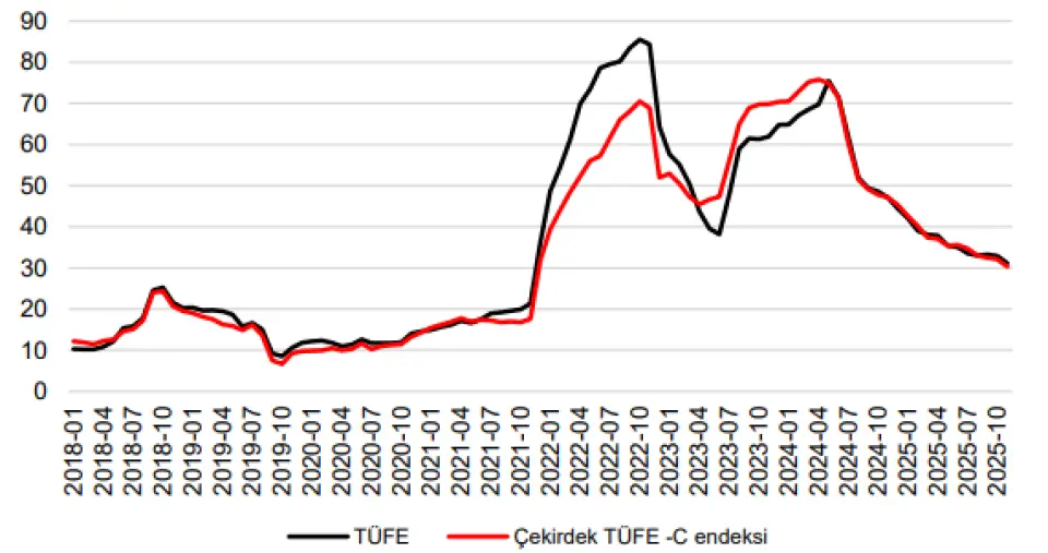 Aylık ÜFE enflasyonu da yavaşladı… TL'nin yabancı para birimleri karşısındaki değer kaybının yavaşlaması sayesinde Kasım ayında ÜFE enflasyonu %0,84 olarak gerçekleşti, ancak yıllık enflasyon bir önceki ayki %27,0'dan Kasım ayında %27,2'ye yükseldi. Alt gruplar arasında metal cevheri ve tütün ürünleri fiyatları sırasıyla %8,0 ve %8,9 artarken, kok kömürü ÜFE %7,7 yükseldi. Öte yandan, mevsimsellik etkisiyle elektrik fiyatları Kasım ayında %3,1 düştü. ÜFE-TÜFE farkı Kasım ayında daha da daraldı, bu da iç talepte kademeli bir soğuma olduğunu gösteriyor. Maliyet baskıları ılımlı seyrini sürdürürse, bu eğilim orta vadede enflasyonun düşmesini destekleyebilir.