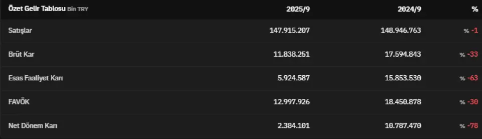 Satışlar 2025 yılının 3. çeyreğinde 147.915.207.000 TL olarak açıklandı. 2025 yılının üçüncü çeyreğinde brüt kar 11.838.251.000 TL olarak açıklandı. 2024 yılının üçüncü çeyreğinde ise bu veri 17.594.843.000 TL olarak açıklanmıştı. Esas faaliyet karını 5.924.587.000 TL olarak açıklayan EREGL, 2024 yılının üçüncü çeyreğinde esas faaliyet karını 15.853.530.000 TL olarak açıklamıştı.FAVÖK 2025 yılının üçüncü çeyreğinde 12.997.926.000 TL olarak açıklandı. Net dönem kârı ise 2.384.101.000 TL olarak kaydedildi.