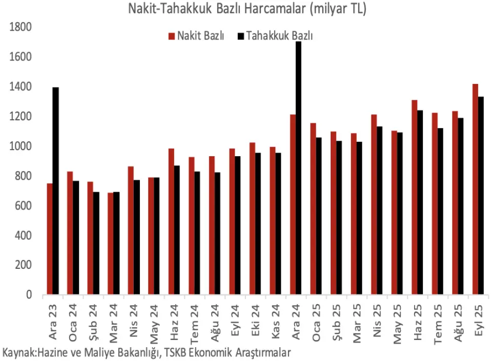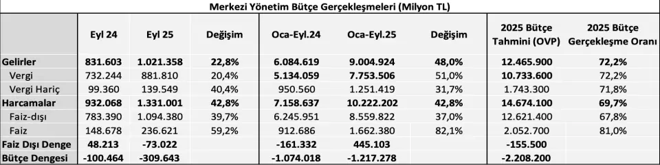 Eylül sonuçlarıyla birlikte 2025 yılının ilk dokuz ayında bütçe gelirleri yıllık bazda %48,0, harcamalar da %42,8 oranında artışlar kaydetti. Toplam bütçe açığı 2024 yılı Eylül ayındaki 1 trilyon 74,0 milyar TL'den 1 trilyon 217,3 milyar TL'ye genişlerken, faiz dışı denge 161,3 milyar TL açıktan 445,1 milyar TL fazlaya döndü.