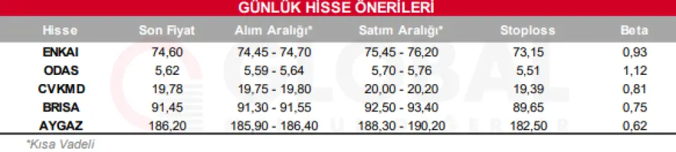 Global Menkul Değerler, piyasaların temkinli seyrettiği bir günde, teknik göstergeler ve güncel veriler ışığında hareket potansiyeli yüksek hisseleri açıkladı. Kurumun değerlendirmesine göre, bugün özellikle ENKAI, ODAS, CVKMD, BRISA ve AYGAZ hisseleri öne çıkıyor. Analistler, söz konusu hisselerde kısa vadede işlem hacmi ve fiyat hareketlerinde artış yaşanabileceğine dikkat çekiyor.