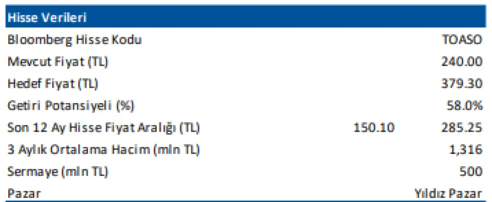 TOASO hissesine verilen hedef fiyat ise379,30 TL ve bu hedef ile beklenen kazanç ise %58 oranında oldu.