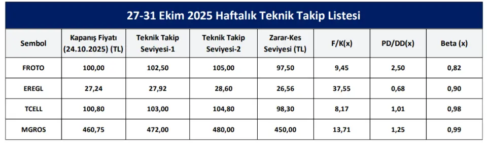 Ikon Menkul, 27 Ekim 2025 tarihinde "Haftalık Teknik Takip Listesi" raporunu paylaştı.