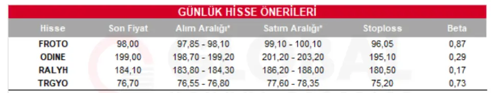 22 Ekim 2025 tarihinde Global Menkul Değerler tarafından paylaşılan günlük bültende, TRGYO, FROTO, ODINE ve RALYH olmak üzere toplam 4 hisse, günlük hisse önerileri listesinde yer almış oldu.