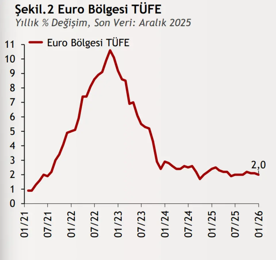 Eurostat verilerine göre Aralık ayında Euro Bölgesi’nde TÜFE yıllık %2’ye gerileyerek AMB’nin hedefiyle uyum sağladı. Çekirdek enflasyon %2,3 olurken hizmet enflasyonu tarafındaki yavaşlama dikkat çekti. Bu tablo, yatırımcıların parasal gevşeme beklentilerini güçlendirdi; piyasalarda Eylül’e kadar beş baz puanlık faiz indirimi fiyatlanıyor. Ancak ücretlerdeki %4’lük artış fiyat istikrarı açısından risk oluşturmaya devam ediyor. Genel görünüm, risklere rağmen enflasyonun kontrol altında olduğunu ortaya koyuyor.