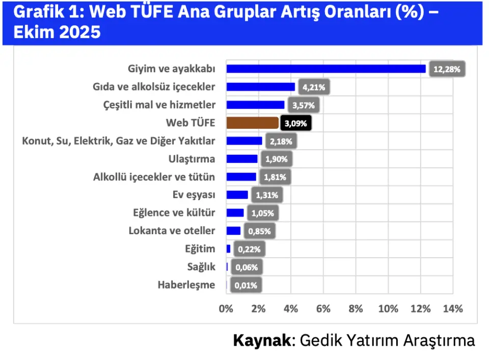 Aracı kurum olan Gedik Yatırım, Ekim 2025 Enflasyon Beklentisi raporunu yatırımcıları ile paylaştı. Aracı kurum, "Ekim ayında enflasyon yüksek seyrini korurken ana eğilimde belirgin bir iyileşme beklemiyoruz. Ekim ayında TÜFE enflasyonunun aylık %2,9 olacağını tahmin ediyoruz." ifadelerine yer verdi.