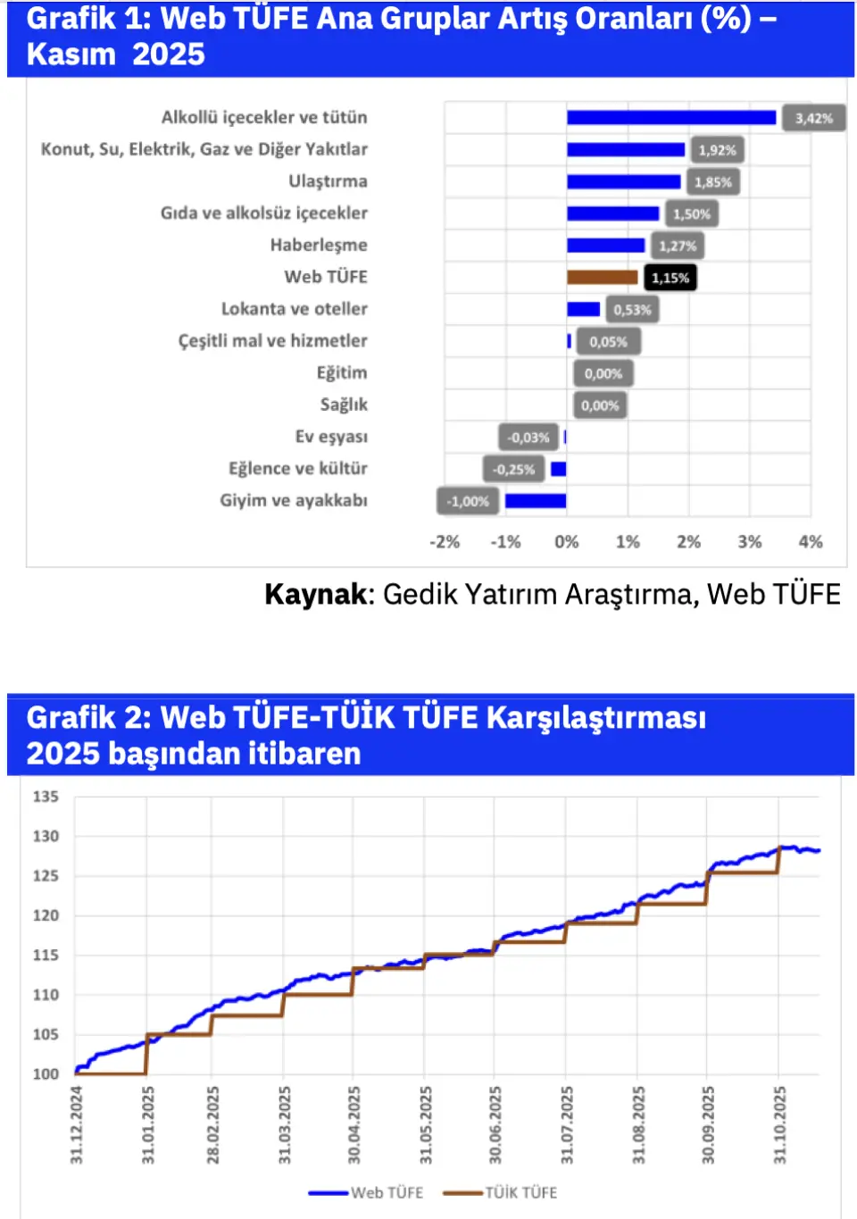 - "Ekim'de web üzerinden topladığımız Web TÜFE verilerine dayanarak aylık enflasyonun %1,3 olarak gerçekleşeceğini ve %1,15 olarak gerçekleşen Web TÜFE verisinin bir miktar üzerinde gerçekleşeceğini değerlendiriyoruz. Yılın son 2 ayı mevsimsel etkilerle enflasyonu aşağı çekerken bu ay özelinde webde Kasım indirimlerinin temel mallarda yoğun etkisini gördük. Saha fiyatlarında bu etkinin daha sınırlı olması sebebiyle resmi enflasyonun web verilerinden sınırlı da olsa üstünde olmasını bekliyoruz."