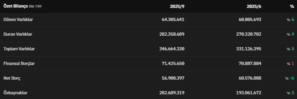 Dönen varlıklar 2025 yılının üçüncü çeyreğinde 64.305.641.000 TL olmuştur. 2025 yılının üçüncü çeyreğinde 282.358.689.000 TL olarak açıklanan duran varlıklar, 2025 yılının ikinci çeyreğinde 270.320.702.000 TL olarak açıklanmıştı. Toplam varlıklar üçüncü çeyrekte 346.664.330.000 TL olarak kaydedildi. Finansal borçlar 2025 yılının üçüncü çeyreğinde 71.425.650.000 TL olarak kaydedildi.2025 yılının üçüncü çeyreğinde net borç 56.900.397.000 TL olarak açıklandı. Özkaynaklar 2025 yılının üçüncü çeyreğinde 202.689.319.000 TL olarak açıklandı. İlgili veri 2025 yılının ikinci çeyreğinde 193.061.672.000 TL olarak açıklanmıştı. Böylece ilgili veri %5 artmış oldu.