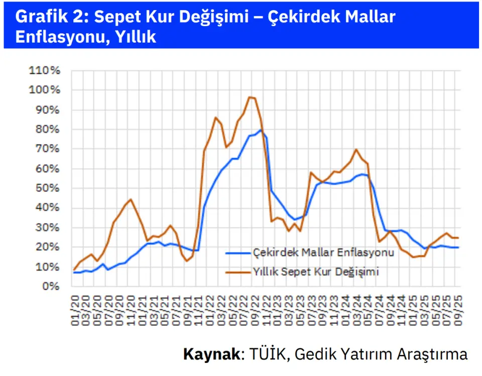 Çekirdek mallar enflasyonu, özellikle de dayanıklı mal grubu, önceki aylara nazaran yüksek gelmiş olsa da, daha ılımlı seyretmeye devam ediyor. Yıllık bazda bakıldığında, hizmet enflasyonu (%44,7) ile temel (çekirdek) mallar enflasyonu (%19,9) arasındaki derin ayrışmanın devam ettiğini söyleyebiliriz. Aylık bazda tahmini en zor kalem haline gelen giyim enflasyonu ise yeni sezona girilmesiyle %3,9 seviyesinde gerçekleşmiş görünüyor, ki beklentimizin az üzerindeki çekirdek enflasyon rakamını buna bağlayabiliriz. Giyim enflasyonunun mevsimsel olarak en yüksek gerçekleştiği ayın Ekim olması (Ekim 2023: %14,0 – Ekim-2024: %14,6) dikkate alındığında, önümüzdeki ay bu kalemden manşet enflasyona ciddi bir katkı (%1 puana yakın) gelebilir. Buna göre, Ekim TÜFE enflasyonu da %2,5-3,0 aralığında gerçekleşebilir.