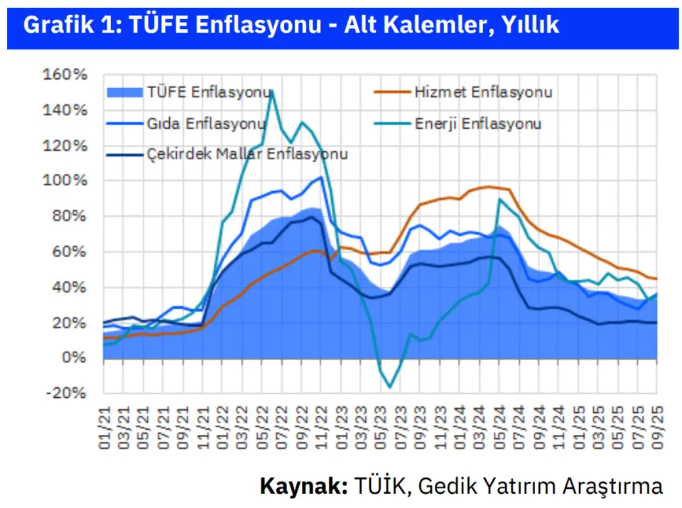 Gedik Yatırım, Eylül ayı TÜFE için rapor yayınladı:Eylül ayı TÜFE enflasyonu beklentilerin oldukça üzerinde %3.23 seviyesinde gerçekleşirken, yıllık TÜFE enflasyonu %33,0’ten %33,3’e yükseldi. Eylül ayında TÜFE enflasyonu %2,50’lik medyan beklenti ve bizim %2,65’lik tahminimizin oldukça üzerinde %3,23 olarak gerçekleşti. Bu sonuçla, yıllık TÜFE enflasyonu da %33,0’ten %33,3’e yükseldi. Böylece yıllık TÜFE enflasyonunun Mayıs 2024’te gördüğü %75,5 zirvesinden başladığı düşüş süreci de bu ay sekteye uğramış oldu. Çekirdek TÜFE enflasyonu (C grubu) bizim %3,1’lik beklentimizin az üzerinde %3,2 olarak gerçekleşerek (Eylül2024: %3,6) yıllık bazda %33,0’ten %32,5’e geriledi. Yurtiçi ÜFE enflasyonu aylık %2,52 seviyesinde gerçekleşerek (Eylül 2024: %1,37) yıllık bazda %25,2’den %26,6’ya yükseldi. Hatırlatmak gerekirse, YİÜFE enflasyonu Nisan’da %22,5 seviyesine kadar gerilemişti.