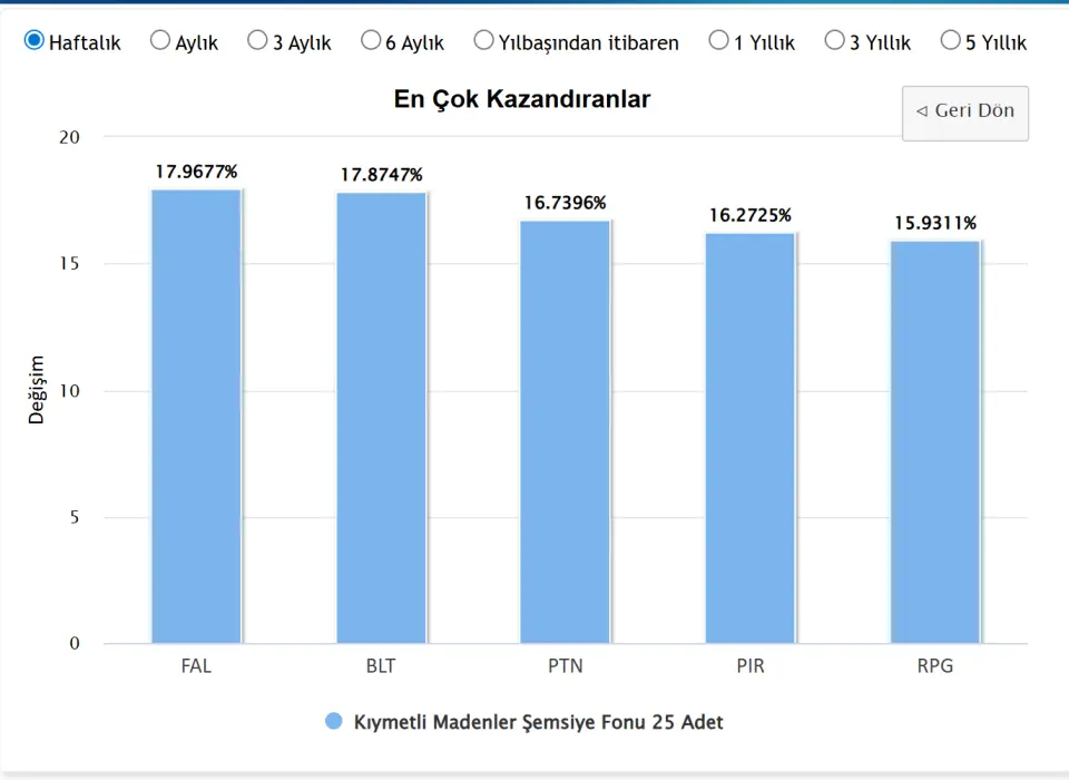 Haftanın lider kategorisi olan Kıymetli Madenler grubu altındaki bireysel fonlar incelendiğinde, şemsiye fon ortalamasının üzerinde getiriler dikkat çekti. Bu kategoride FAL kodlu fon, haftalık bazda %17,96 oranında değer kazanarak listenin ilk sırasında yer aldı. Zirveyi çok küçük bir farkla takip eden BLT kodlu fon %17,87 getiri sağlarken, PTN kodlu fon yatırımcısına %16,73 oranında kazanç sundu. Listenin üst sıralarında yer alan diğer fonlar olan PIR ve RPG ise sırasıyla %16,27 ve %15,93 oranında yükseliş kaydetti.