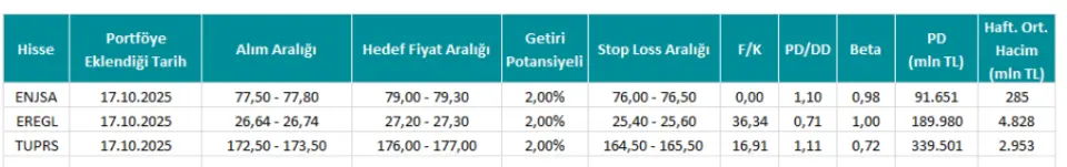 Hisselerin portföyle eklendiği tarih 17.10.2025 olarak kaydedildi. ENJSA hissesi için hedef fiyat aralığı 79,00 - 79,30 olarak açıklandı. EREGL hissesine açıklanan hedef fiyat aralığı ise 27,20 - 27,30 olarak listeye yansıdı. TUPRS hissesi için açıklanan hedef fiyat aralığı 176,00 - 177,00 olarak yatırımcılar ile paylaşıldı.