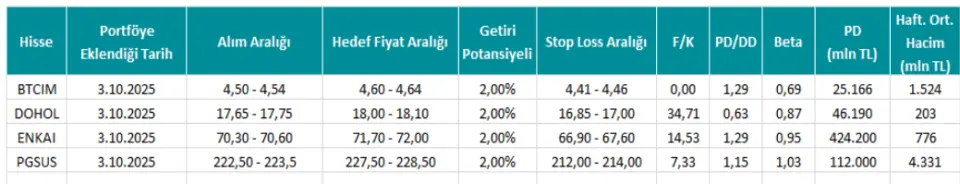 Hisselerin portföyle eklendiği tarih 03.10.2025 olarak kaydedildi. BTCIM hissesi için hedef fiyat aralığı 4,50 - 4,54 olarak açıklandı. DOHOL hissesine açıklanan hedef fiyat aralığı ise 17,65 - 17,75 olarak listeye yansıdı. ENAKI hissesi için açıklanan hedef fiyat aralığı 70,30 - 70,60 olarak yatırımcılar ile paylaşıldı. Son olarak PGSUS hissesi için açıklanan hedef fiyat aralığı 227,50 - 228,50 olarak açıklandı.