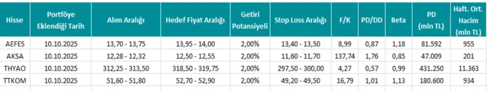 Hisselerin portföyle eklendiği tarih 10.10.2025 olarak kaydedildi. AEFES hissesi için hedef fiyat aralığı 13,95 - 14,00 olarak açıklandı. AKSA hissesine açıklanan hedef fiyat aralığı ise 12,50 - 12,55 olarak listeye yansıdı. THYAO hissesi için açıklanan hedef fiyat aralığı 318,50 - 319,75 olarak yatırımcılar ile paylaşıldı. Son olarak TTKOM hissesi için açıklanan hedef fiyat aralığı 52,70 - 52,90 olarak açıklandı.