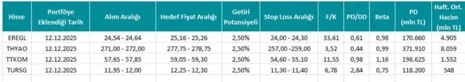 Hisselerin portföyle eklendiği tarih 12.12.2025 olarak kaydedildi. EREGL hissesi için hedef fiyat aralığı 25,16 - 25,26 olarak açıklandı. THYAO hissesine açıklanan hedef fiyat aralığı ise 277,75 - 278,75 olarak listeye yansıdı. TTKOM hissesi için açıklanan hedef fiyat aralığı 59,05 - 59,30 olarak yatırımcılar ile paylaşıldı. Son olarak TURSG hissesi için hedef fiyat aralığı 12,25 - 12,30 olarak açıklandı.