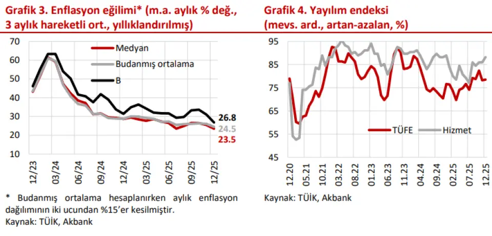 Yurt içinde aylık enflasyon %0,89 ile tahminimizle (%0,9) uyumlu gerçekleşirken, yıllık enflasyon 0,2 puan düşüşle %30,9’a geriledi ve TCMB’nin son Enflasyon Raporu’nda paylaştığı tahmin bandının (%31-%33) sınırlı şekilde altında kaldı. Son dönemde para politikası iletişiminde öne çıkarılan medyan enflasyon %1,7 oldu (önceki %1,8). Son üç ayın ortalama medyan eğilimini yıllıklandırılmış olarak %23,5 seviyesinde hesaplıyoruz (Makro: Yıl sonundaki eğilim 2026 hedeflerinin üzerinde bir enflasyona işaret ediyor).