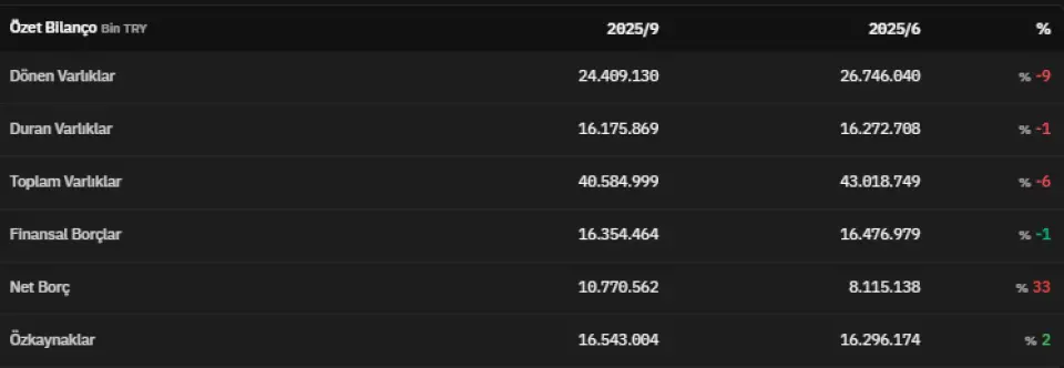 Dönen varlıklar 2025 yılının üçüncü çeyreğinde 24.409.130.000 TL olmuştur. 2025 yılının üçüncü çeyreğinde 16.175.869.000 TL olarak açıklanan duran varlıklar, 2025 yılının ikinci çeyreğinde 16.272.708.000 TL olarak açıklanmıştı. Toplam varlıklar üçüncü çeyrekte 40.584.999.000 TL olarak kaydedildi. Finansal borçlar 2025 yılının üçüncü çeyreğinde 16.354.464.000 TL olarak kaydedildi. 2025 yılının ikinci çeyreğinde 16.476.979.000 TL olarak açıklanan finansal borçlar, üçüncü çeyrekte %1 azalmış oldu.