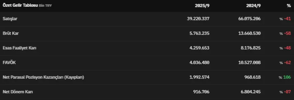 FAVÖK 2025 yılının üçüncü çeyreğinde 4.036.480.000 TL olarak açıklandı. Net parasal pozisyon kazançları 2025 yılının üçüncü çeyreğinde 1.992.574.000 TL olarak kaydedildi. 2024 yılının üçüncü çeyreğinde 968.618.000 TL olarak açıklanan net parasal pozisyon kazançları, 2025 yılının üçüncü çeyreğinde %106 artmış oldu. Net dönem kârı ise 916.706.000 TL olarak kaydedildi. İlgili veri 2024 yılının üçüncü çeyreğinde 6.804.245.000 TL olarak açıklanmıştı.