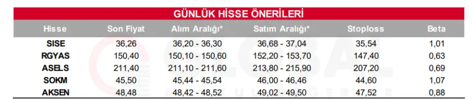 30 Ekim 2025 tarihinde Global Menkul Değerler tarafından paylaşılan günlük bültende, SISE, RGYAS, ASELS, SOKM ve AKSEN olmak üzere toplam 5 hisse, günlük hisse önerileri listesinde yer almış oldu.