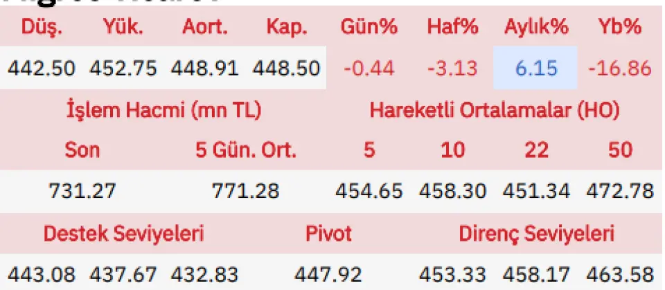 "Migros Ticaret güne alımlarla başlarken gün içinde en düşük 442.50 seviyesini gördü (kapanışa göre 8.00 TL) ve en yüksek olarak 452.75 değerine gelip (kapanışa göre -2.25 TL) ve günü başlangıcına oranla %0.79 pozitif önceki kapanışına göre %0.44 negatif tamamladı.Hissenin ilk destek noktası 443.08 onun altında da 437.67 noktası olacaktır, yükselişlerde de direnç noktaları olarak 453.33 ve 458.17 seviyeleri takip edeceğiz."