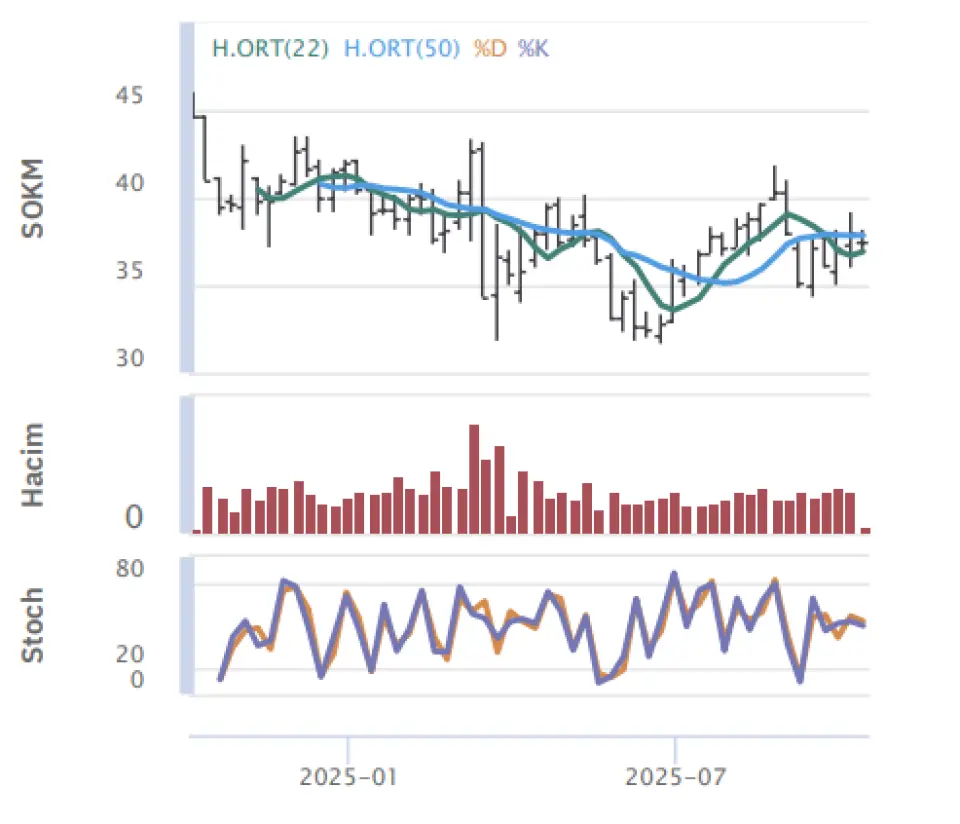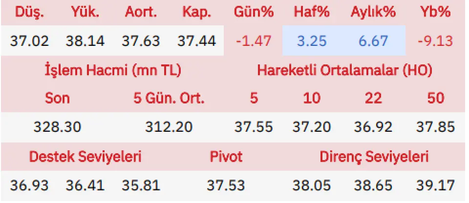 "Günü yükselişle açan Şok Marketler Ticaret gün içinde 37.02 seviyesine gerilerken en yüksek ise 38.14 seviyesini gördü ve günü açılışına göre %0.32 aşağıda önceki güne göre de %1.47 aşağıda tamamladı.Hissede ilk destek noktası olarak 36.93 seviyesini görüp onun altına düşüş yaşandığında da 36.41 seviyesinde destek noktalarının olacağını bekliyoruz, yukarı yönlü hareketlerde de direnç noktaları olarak 38.05 ve 38.65 seviyeleri takibimizde yer almakta."