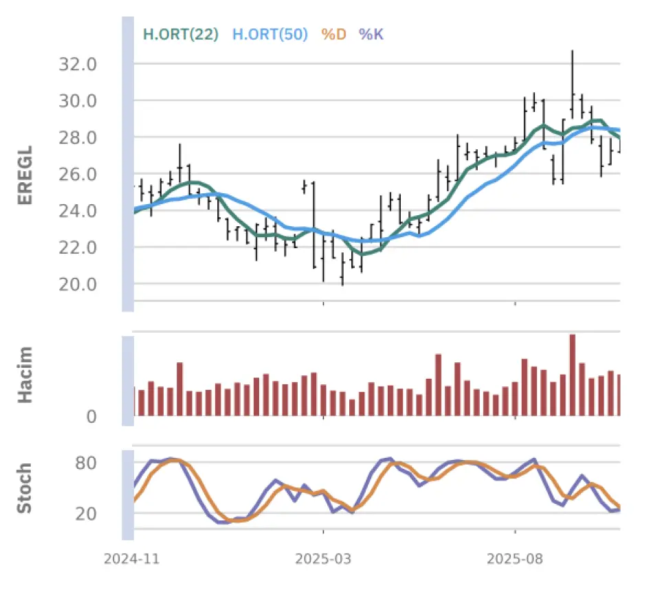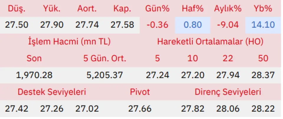 "Gün içinde en düşük 27.50 en yüksek 27.90 seviyesini gören Ereğli Demir ve Çelik Fabrikaları hissesinin günü %0.36 kayıpla tamamladığı gözlenmektedir. Pivot seviye 27.66 seviyesinden geçmekte olup, aşağı yönlü hareketlerde birinci destek 27.42, ikinci destek ise 27.26 seviyesinden geçmektedir. Dirençler ise sırasıyla 27.82, 28.06 seviyelerinden geçmektedir. Bu aşamada endeksin 5 günlük HO seviyesinin %1.26 üstünde, 22 günlük HO seviyesinin ise %1.29 altında hareket ettiği dikkat çekmektedir. Son gün işlem hacmi ise bu aşamada 5 günlük ortalama işlem hacminin % 62.15 altında gerçekleşmiştir."