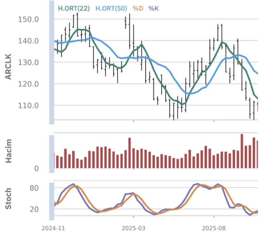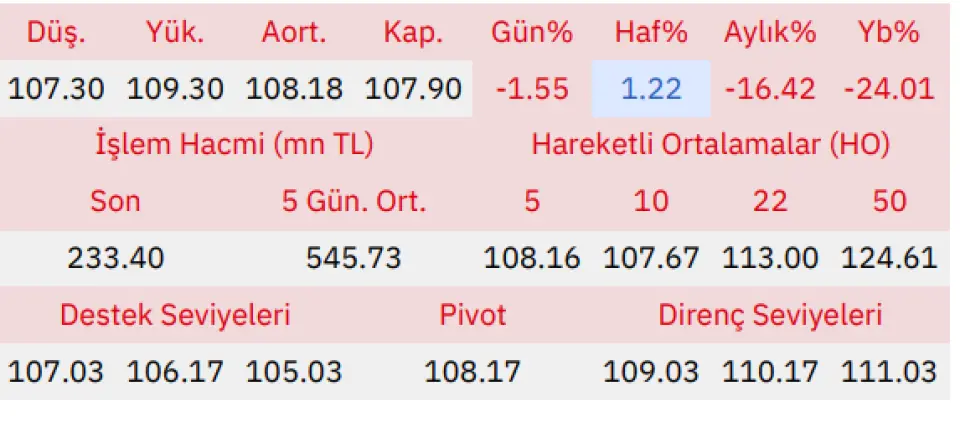 "Gün içinde en düşük 107.30 en yüksek 109.30 seviyesini gören Arçelik hissesinin günü %1.55 kayıpla tamamladığı gözlenmektedir. Pivot seviye 108.17 seviyesinden geçmekte olup, aşağı yönlü hareketlerde birinci destek 107.03, ikinci destek ise 106.17 seviyesinden geçmektedir. Dirençler ise sırasıyla 109.03, 110.17 seviyelerinden geçmektedir. Bu aşamada endeksin 5 günlük HO seviyesinin %0.24 altında, 22 günlük HO seviyesinin ise %4.51 altında hareket ettiği dikkat çekmektedir. Son gün işlem hacmi ise bu aşamada 5 günlük ortalama işlem hacminin % 57.23 altında gerçekleşmiştir."