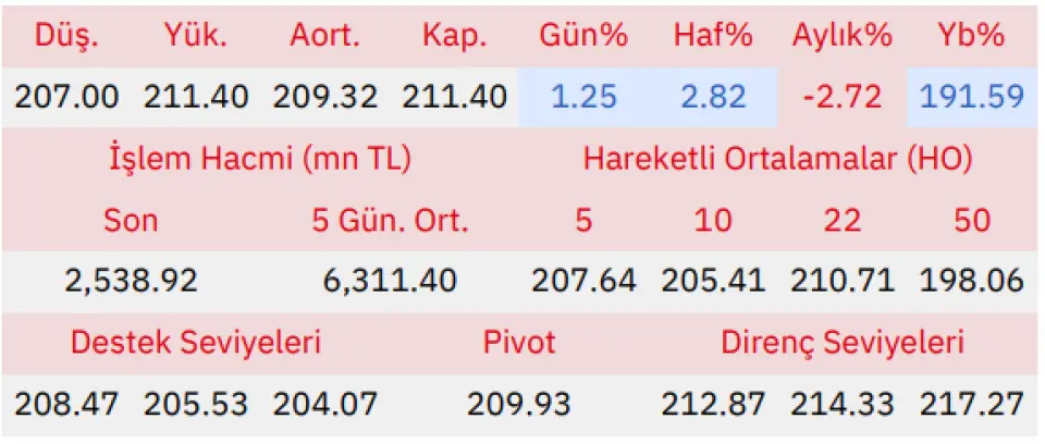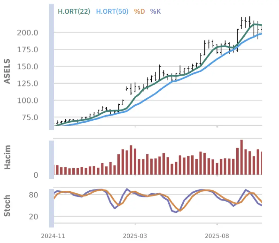 "Gün içinde en düşük 207.00 en yüksek 211.40 seviyesini gören Aselsan Elektronik hissesinin günü %1.25 kazançla tamamladığı gözlenmektedir. Pivot seviye 209.93 seviyesinden geçmekte olup, aşağı yönlü hareketlerde birinci destek 208.47, ikinci destek ise 205.53 seviyesinden geçmektedir. Dirençler ise sırasıyla 212.87, 214.33 seviyelerinden geçmektedir. Bu aşamada endeksin 5 günlük HO seviyesinin %1.81 üstünde, 22 günlük HO seviyesinin ise %0.33 üstünde hareket ettiği dikkat çekmektedir. Son gün işlem hacmi ise bu aşamada 5 günlük ortalama işlem hacminin % 59.77 altında gerçekleşmiştir."