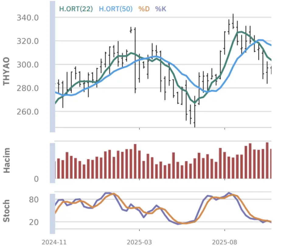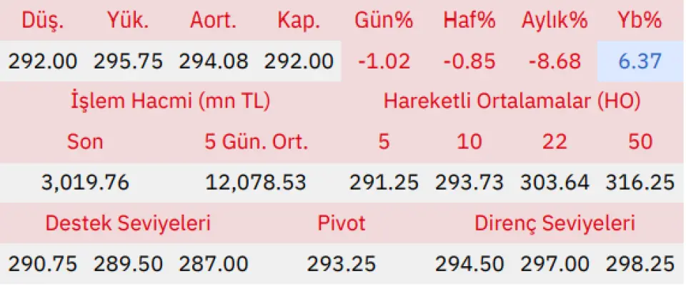 "Gün içinde en düşük 292.00 en yüksek 295.75 seviyesini gören Türk Hava Yolları hissesinin günü %1.02 kayıpla tamamladığı gözlenmektedir. Pivot seviye 293.25 seviyesinden geçmekte olup, aşağı yönlü hareketlerde birinci destek 290.75, ikinci destek ise 289.50 seviyesinden geçmektedir. Dirençler ise sırasıyla 294.50, 297.00 seviyelerinden geçmektedir. Bu aşamada endeksin 5 günlük HO seviyesinin %0.26 üstünde, 22 günlük HO seviyesinin ise %3.83 altında hareket ettiği dikkat çekmektedir. Son gün işlem hacmi ise bu aşamada 5 günlük ortalama işlem hacminin % 75.00 altında gerçekleşmiştir."