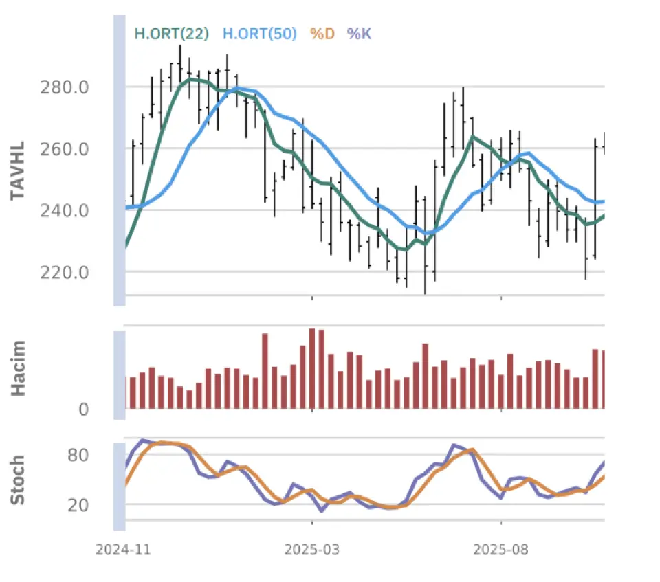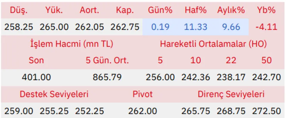 "Gün içinde en düşük 258.25 en yüksek 265.00 seviyesini gören TAV Havalimanları Holding hissesinin günü %0.19 kazançla tamamladığı gözlenmektedir. Pivot seviye 262.00 seviyesinden geçmekte olup, aşağı yönlü hareketlerde birinci destek 259.00, ikinci destek ise 255.25 seviyesinden geçmektedir. Dirençler ise sırasıyla 265.75, 268.75 seviyelerinden geçmektedir. Bu aşamada endeksin 5 günlük HO seviyesinin %2.64 üstünde, 22 günlük HO seviyesinin ise %10.32 üstünde hareket ettiği dikkat çekmektedir. Son gün işlem hacmi ise bu aşamada 5 günlük ortalama işlem hacminin % 53.68 altında gerçekleşmiştir"