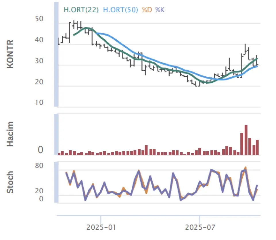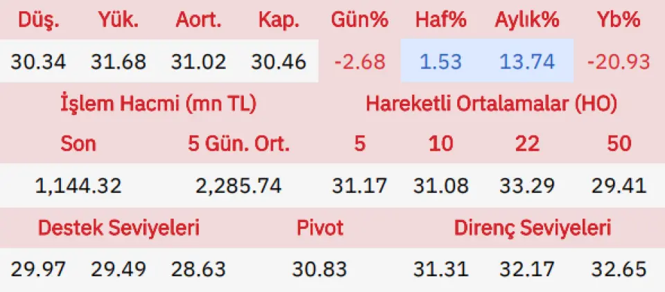 "Seans başlangıcında piyasada alımla başlayan Kontrolmatik Teknoloji hissesi, gün içinde en düşük olarak 30.34 seviyesine gerilerken en yüksek 31.68 değeri gördü ve günü seans açılışına oranla yüzde 2.68 düşüşle, önceki gün kapanış fiyatına göre yüzde 2.68 getiriyle tamamladı.Gün içinde şirket için ilk destek noktamız 29.97 ikinci destek noktası da 29.49 seviyeleri olacak, direnç bölgesi olarak da 31.31 ve 32.17 seviyeleri takibimizde olacak."