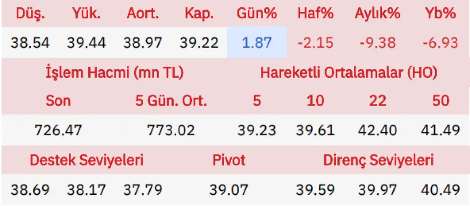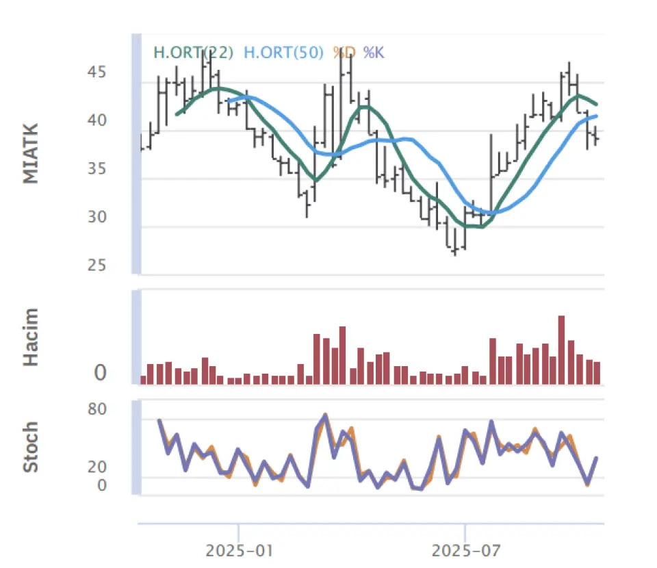 "Mia Teknoloji, güne alımlarla başlarken gün içinde en düşük 38.54 seviyesini gördü ve en yüksek olarak 39.44 değerine gelip günü başlangıcına oranla yüzde 0.1 pozitif, önceki kapanışına göre yüzde 1.87 pozitif tamamladı.Gün içinde şirket için ilk destek noktamız 38.69 ikinci destek noktası da 38.17 seviyeleri olacak, direnç bölgesi olarak da 39.59 ve 39.97 seviyeleri takibimizde olacak."
