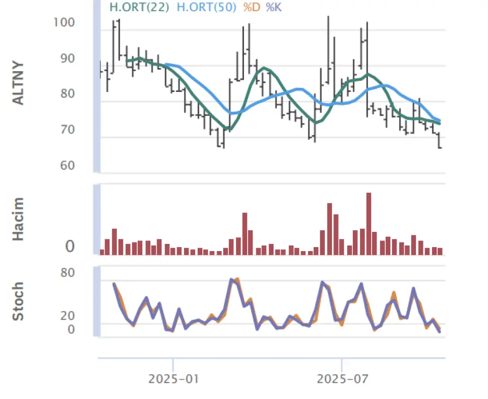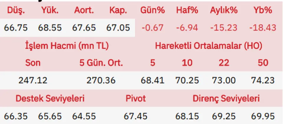 "Seans başlangıcında piyasada alımla başlayan Altınay Savunma hissesi, gün içinde en düşük olarak 66.75 seviyesine gerilerken en yüksek 68.55 değeri gördü ve günü seans açılışına oranla yüzde 0.67 düşüşle, önceki gün kapanış fiyatına göre yüzde 0.67 getiriyle tamamladı.Gün içinde şirket için ilk destek noktamız 66.35 ikinci destek noktası da 65.65 seviyeleri olacak, direnç bölgesi olarak da 68.15 ve 69.25 seviyeleri takibimizde olacak."